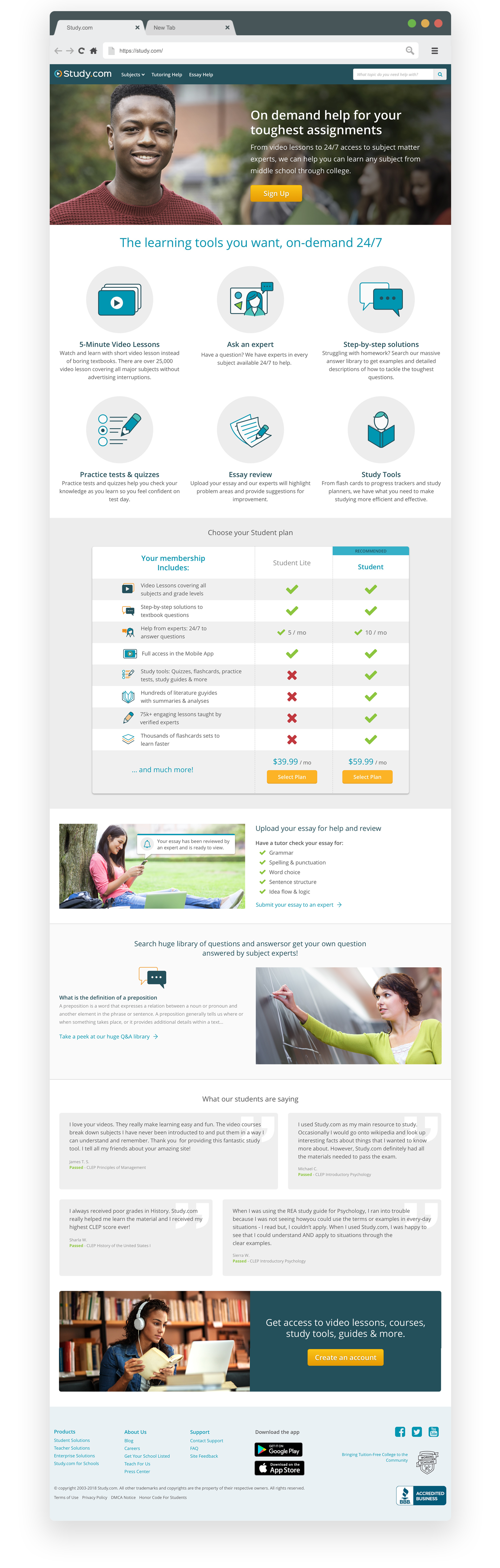 The design summarizes everything Study.com has to offer the Student. The page uses an abundance of SEO words to drive the most traffic to this page.